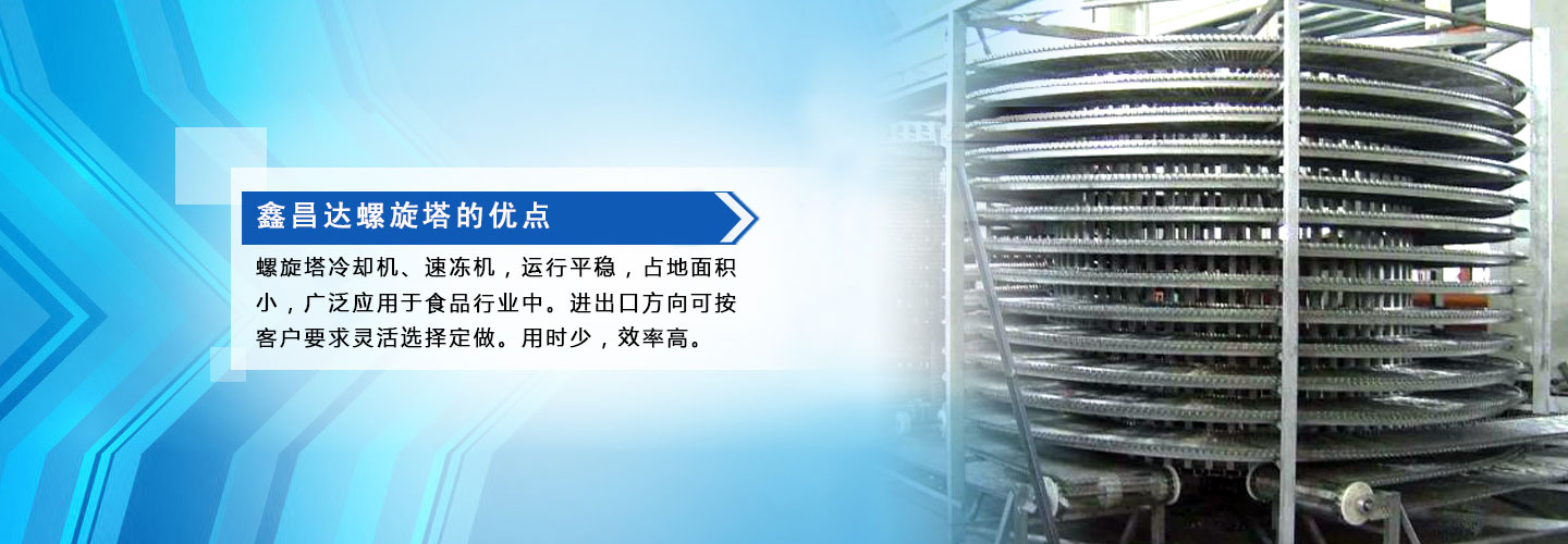 寧津縣鑫昌達機械廠主營食品回盤線,面包螺旋冷卻塔,輸送機設備,面食品、菜卷、春卷、蔬菜、水果、肉食、油炸品、小包裝食品的輸送,分單塔和雙塔多層不銹鋼機身,占地面積小,輸送量大,采用食品級螺旋網帶易清洗和維護。要形成三到6個月之間對螺旋冷卻塔進行定期檢查,若是內部出現問題,應當由專業技術人員對其維修。